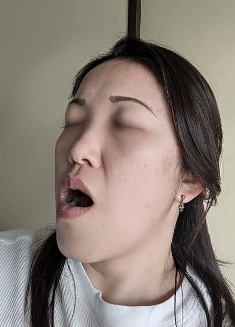 口に入れられた指を舌で舐めるパートさん